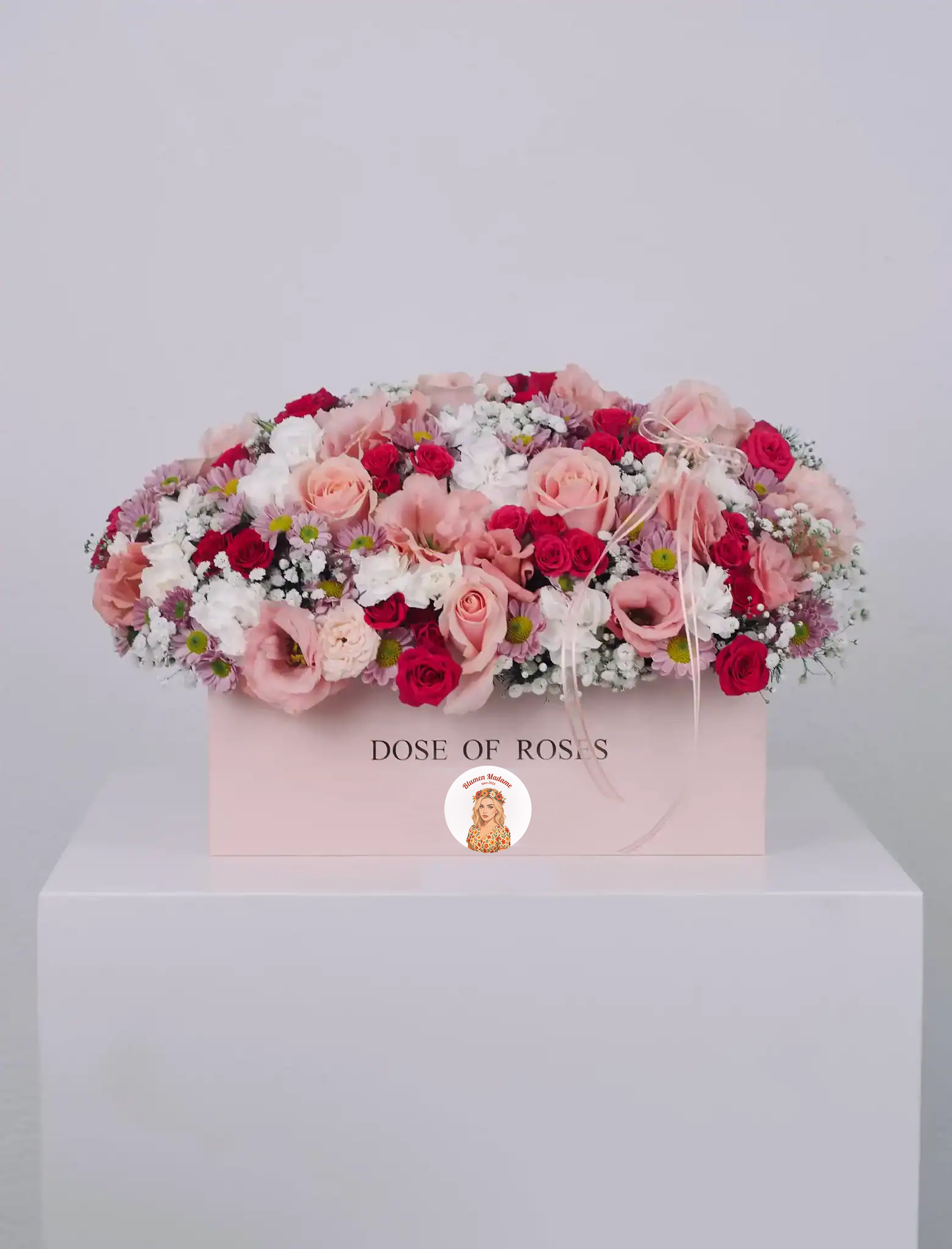 Die Blumenauswahl kann je nach Saison und Verfügbarkeit auf dem Blumenmarkt variieren und richtet sich nach dem Geschmack des Floristen.